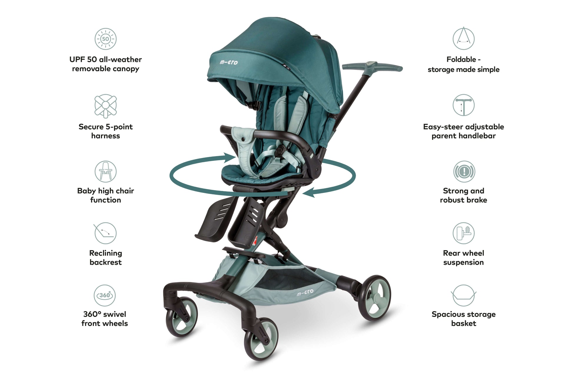The reclining backrest and 360° swivel seat offer endless possibilities, from cosy naps to interactive playtime.