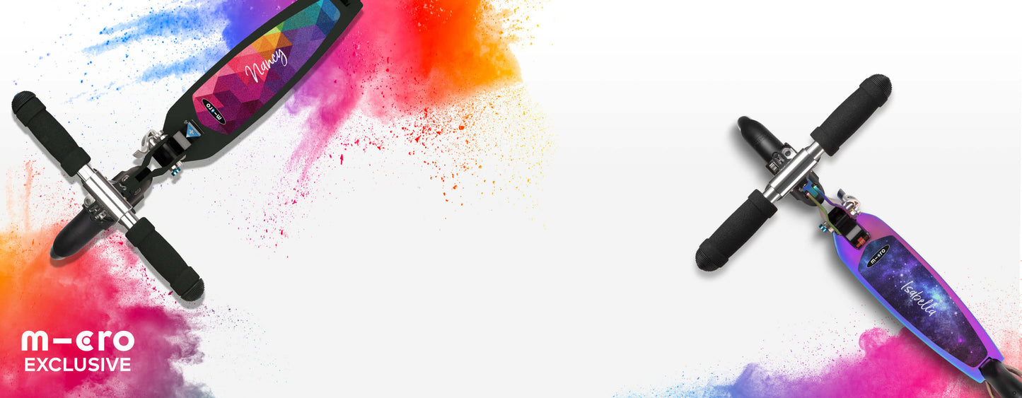 Foldable and adjustable. Intrinsically designed with grown-ups in mind. The decks of the scooters are longer and wider – perfect for taller riders. The handlebars go higher. The brakes are longer. Because why should the kids have all the fun?