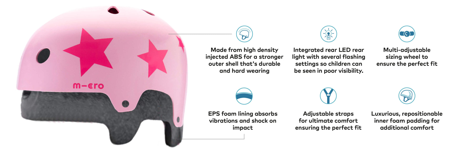 With air vents to keep heads cool, configurable foam padding to keep heads comfy and with thoughtful details like pinch free buckles, chin straps and lights, a Micro helmet is the perfect bike accessory and a natural finishing touch for all scooter riders.