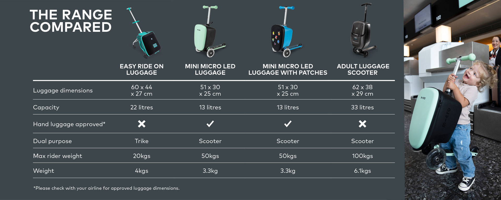 All our scooters with bags conform to most airline’s hand luggage dimensions. However, sometimes airlines do change the sizing/dimensions they allow on board. Please check with your airline before taking a Micro scooter suitcase on board with you.