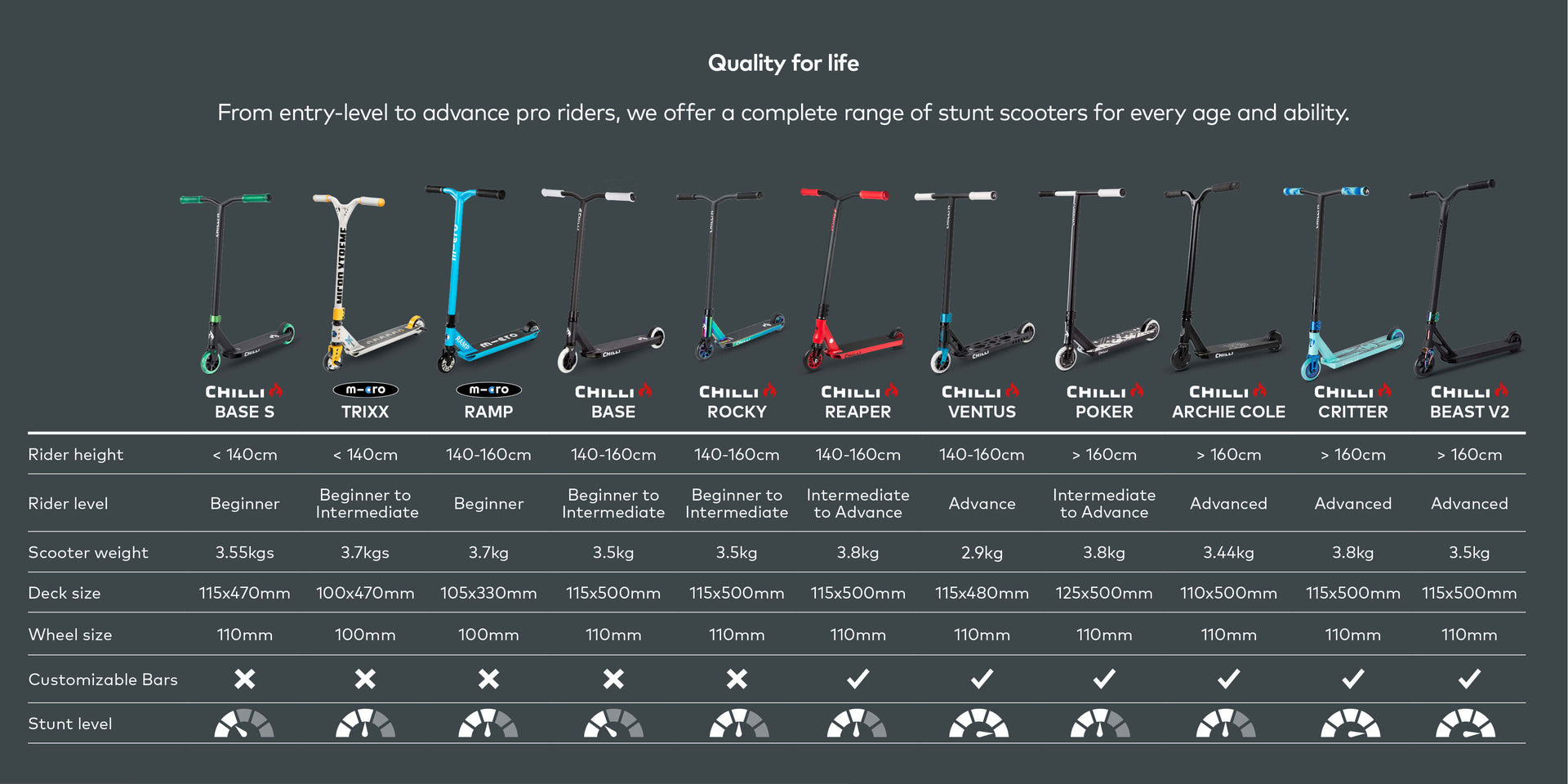 Chilli mirrors Micro Scooter's longstanding reputation for high-quality construction and performance, making them the number one choice for a stunt scooter. Chilli scooters consistently deliver on performance whilst withstanding the wear and tear of even the most intense tricks and stunts.