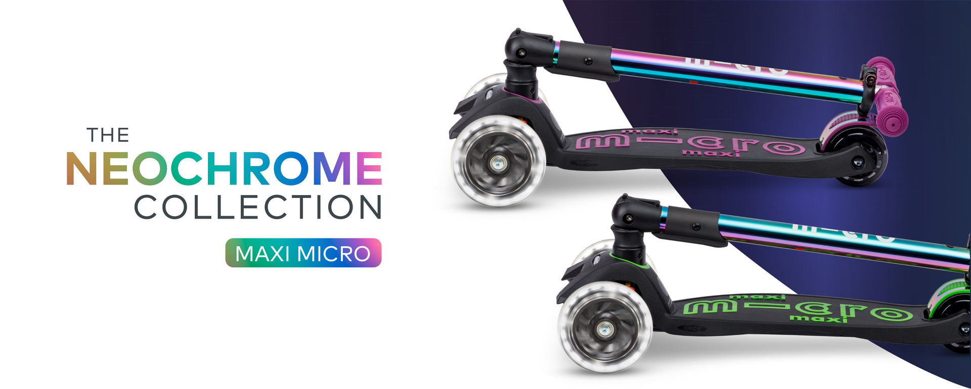 Our premium MaxiFoldable scooter now glows with a shimmering multicolour Neochrome sheen – exclusive, standout and unlike anything else on three wheels.